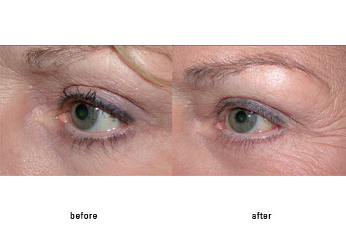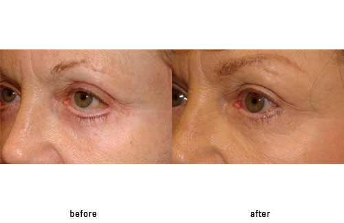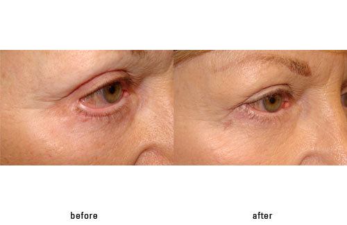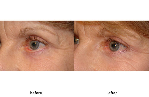 This woman also had lower lid cosmetic lower lid surgery elsewhere. She was left with an ectropic (turned-out) lower lid on the left after surgery. I revised the lid, in the office under local anesthesia with an excellent result